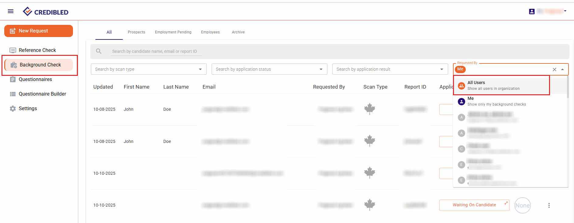 Click the dropdown menu on the right-hand side, then select the “All Users” link. This will give you access to the background check details for all employees.